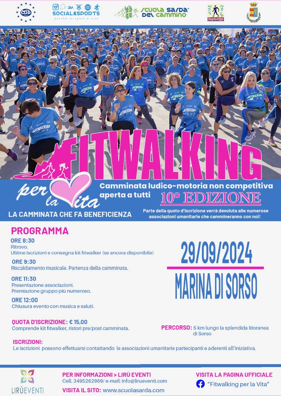 Si rinnova l’appuntamento con la 10° edizione della manifestazione FITWALKING PER LA VITA: la camminata ludico-motoria non competitiva aperta a tutti che vede il coinvolgimento di numerose Associazioni di volontariato. La LIFC Sardegna ODV anche quest’anno sarà presente con il proprio stand dove i nostri Volontari distribuiranno il kit della manifestazione, che comprende anche la T-Shirt ufficiale dell’evento