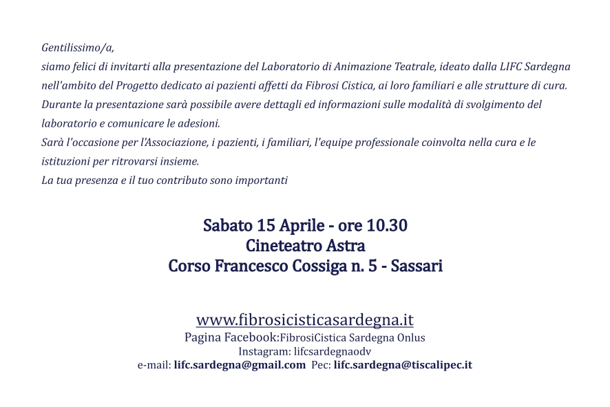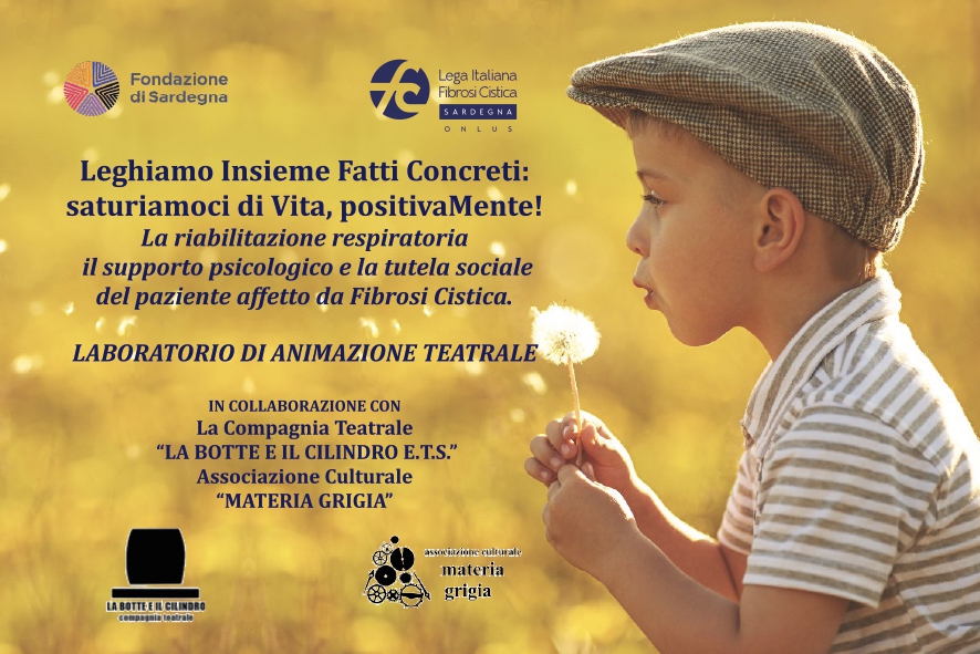 Per questo motivo e con l’intento di offrire uno spazio di confronto, ludico e creativo, a tutti coloro che vivono la malattia, la LIFC Sardegna ODV è lieta di presentare il Laboratorio di Animazione Teatrale rivolto a pazienti, familiari, operatori sanitari e simpatizzanti. Il laboratorio nasce nell’ambito del Progetto della LIFC Sardegna ODV “Leghiamo Insieme Fatti Concreti: saturiamoci di Vita, positivaMente!, mediante il quale la nostra Organizzazione ha erogato per diverse annualità, presso il Centro di Supporto FC di Alghero, i servizi di fisioterapia e riabilitazione respiratoria e di supporto psicologico. Attualmente continuiamo a garantire il servizio di supporto psicologico e psicoterapico al di fuori della struttura ospedaliera.