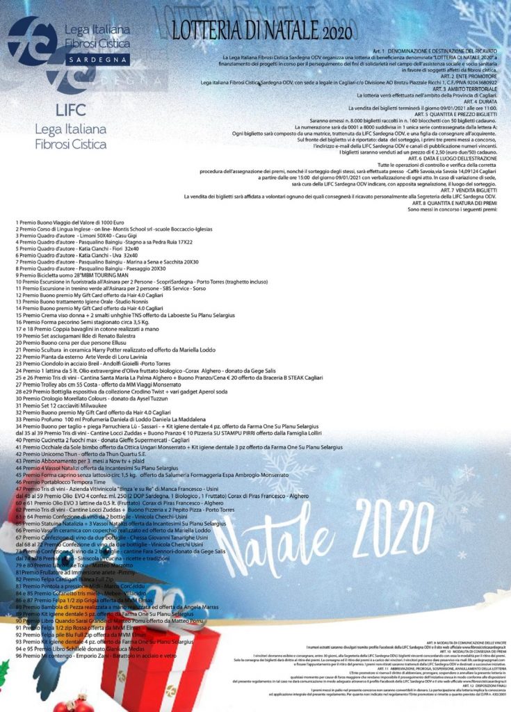 Si rinnova il tradizionale appuntamento con la “LOTTERIA DI NATALE 2020“, la lotteria di beneficenza organizzata dalla LIFC Sardegna ODV per finanziare i propri Progetti in corso per il perseguimento dei fini si solidarietà nel campo dell’assistenza sociale e socio sanitaria in favore dei soggetti affetti da fibrosi cistica.
